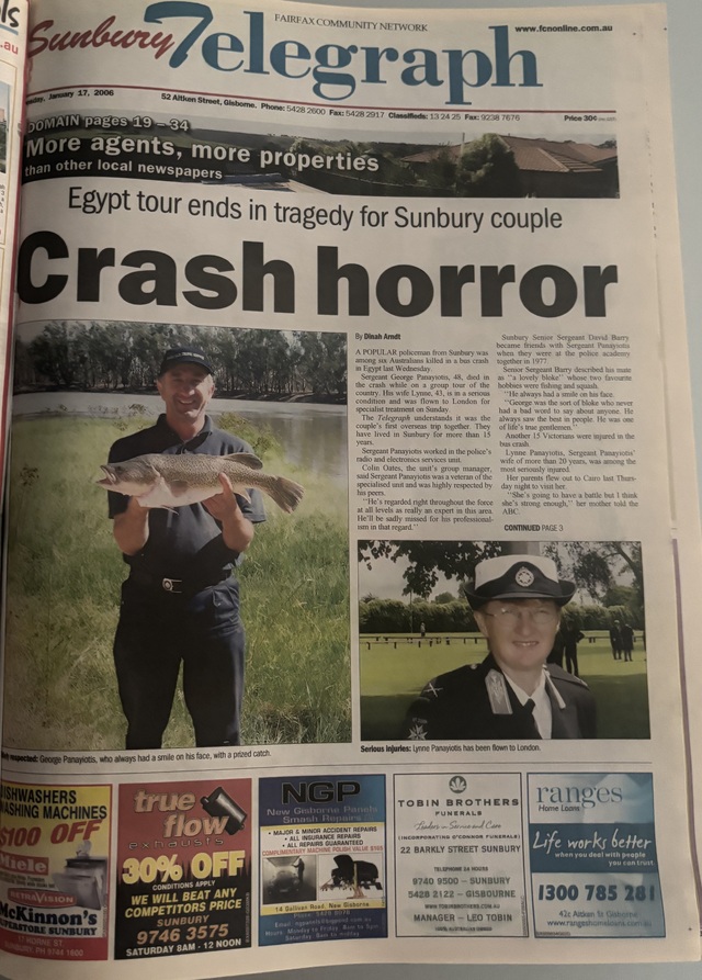 A popular policeman from Sunbury was among six Australians killed in a bus crash in Egypt last Wednesday.